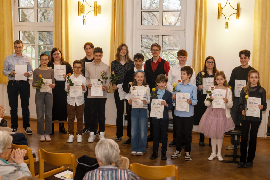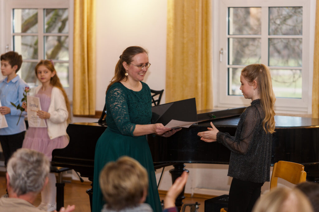 Durch ein überreichtes Zertifikat zur Teilnahme am Solistenkonzert, untermauert vom stetigen Applaus des Publikums, hat die Schulleiterin Lotta Göttsche die herausragenden Leistungen der Schüler:innen gewürdigt.